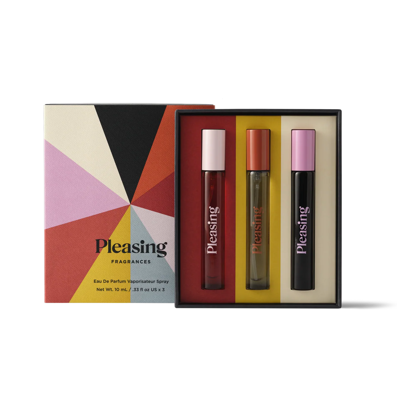 A kaleidoscope of all three Pleasing Fragrances packed into a single, color-happy set to encourage mixing, matching, sharing, and playing. The Pleasing Fragrance Spritz Trio Set includes woody-amber Bright Hot, fresh-floral Rivulets, and clean-sheets-and-musk Closeness.